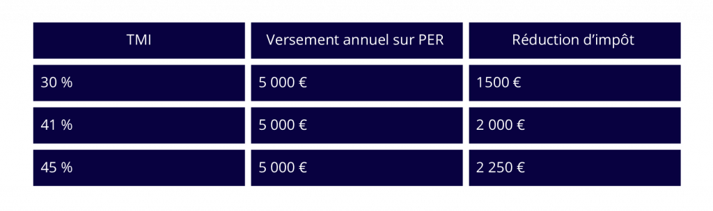 Le mécanisme d’allègement fiscal du PER est plutôt destiné à des profils d’épargnants ayant une TMI importante : minimum 30%. En effet la réduction d’impôt est calculée en fonction du montant des versements et du taux marginal d’imposition du souscripteur. Plus la tranche marginale d’imposition est élevée, plus l’avantage fiscal sera important.